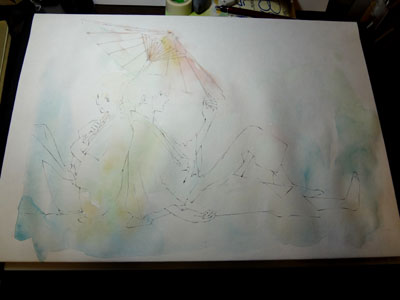 水張りして、軽く下塗りしたところです。