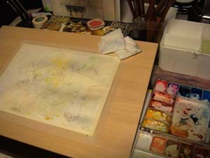 着色中のひじおき絵。…画質のせいで何なのかまるでわからないですが…(汗)。下塗りを今乾かし中です。