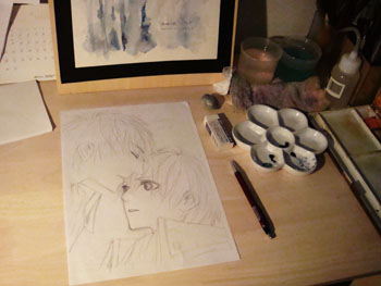 新刊の表紙の下書きを描き描き。ちなみに上部↑に写っているのは裏表紙の一部でございます。今回は何故か裏表紙から仕上げました。何故! いや、気分です、きっと。(きっとですか) 何気に本文の執筆はすべて終わりまして、残すは表紙のみでございます。週末は予定がもろもろあるので、仕上げられるのは来週半ばくらいになるでしょうか。。。表紙ができましたら、新刊のサンプルページをあぷする予定ですので、しばしお待ちを!