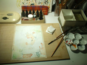 ひじおき絵を一枚追加いたしました。今回はちゃんとした(?)水彩紙を使用いたしました。他の絵と見た目の仕上がりは変わらないかもしれませんが・・・やっぱり塗り心地が良かったでございます。Yo。(あ、本の表紙などにはやや高価な水彩紙を使用いたしているのですが、普段サイトに載せている絵には画用紙を使用していることが多いのです)